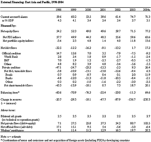 · Net private (debt and equity) flows to the region have increased dramatically since the Asian crisis in 1997/98, reaching US$103.5 billion in 2004, up from a low of US$7.1 billion in 1998. The US$96.5 billion increase largely reflects a US$73.5 billion increase in net private debt flows, along with a US$23.6 billion increase in net equity inflows to the region.