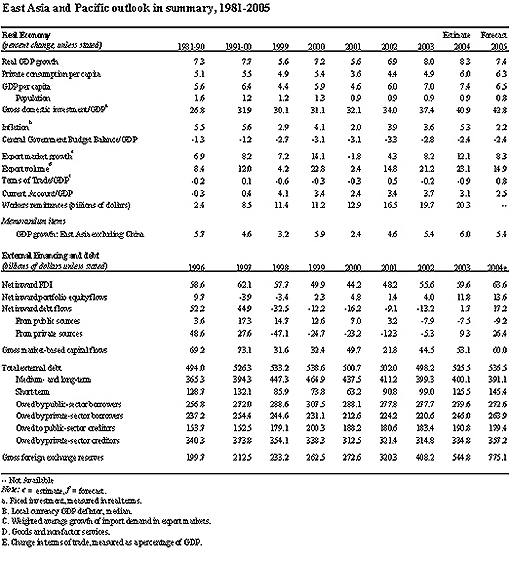 · A supportive external environment characterized by a record expansion in world trade, regional current account surpluses and rising foreign reserves has bolstered investor confidence in many economies. Growth in the region is projected to decline to a more sustainable rate of 7.4 percent in 2005, with China continuing to be the dominant economy in the region.