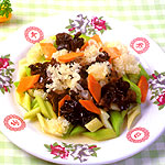 Ingredients: 250 grams (0.66 lb) of celery 100 grams (0.22 lb) black fungus 100 grams (0.22 lb) tremella 10 grams (2 tsp) water 2 grams (1/3 tsp) salt 1 grams (1/4 tsp) MSG 2 grams (2/5 tsp) cooking wine 100 grams (7 tbsp) salad oil (only half too be consumed) 2 grams (2/5 tsp) sesame oil