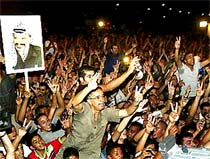 "You are brave people, my loved ones. Abu Ammar is staying here," Arafat later told a huge crowd at his headquarters in the West Bank city of Ramallah, using his nom de guerre as he blew kisses and flashed the V-for-victory sign.