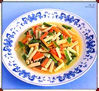3. Heat the oil in a wok to 70-100oC (160-210oF) and fry the scallion and ginger until they give off a strong aroma. Stir-fry the carrots for 1 minutes, add the cucumbers and bamboo shoots and water to simmer for 1 minutes. Add the salt and MSG, and use the mixture of cornstarch and water to thicken the sauce. Sprinkle on the sesame oil. Bring out and serve.