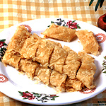 3. Put the oil into the pan and heat it till it is 110-135oC (230-275oF). Deep-fry the dough strips and quickly bring them out once bubbles appear on their surface. Drain off the oil and put them on the chopping board. Sprinkle the sesame mixture while the strips are still hot. Roll them into long strips and cut into diamond shapes. Now they are ready to serve.