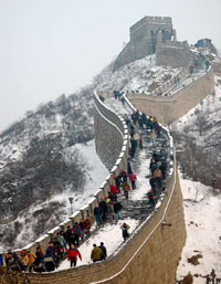 Strong cold air from Siberia has swept across China and caused temperatures to drop as much as 10 C in some regions, as early snow has dusted the Great Wall and area mountaintops.