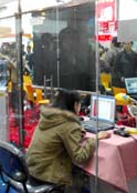 Some sat in front of notebooks chatting with the two participants in the glass enclosures via OICQ and some gathered around outside, where all the activities of the participants could be watched, except for their occasional forays into a small washroom.