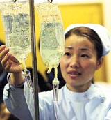 The photo shows that the Shanghai East Hospital nurse Yu Lei takes care of patients packing into treatment rooms yesterday. Abruptly changing temperatures have caused more colds in the city.