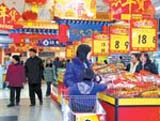 The picture shows that customers select goods in the Darunfa Supermarket in Yantai, east China's Shandong Province. As the Spring Festival draws near, many stores set aside a special section for patrons to choose so-called nianhuo, mostly seasonal food, home decorations and gifts.