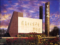 Geographical Location Tianjin Economic and Technological Development Area (TEDA) is located to the southeast of Tianjin City, about 45 kilometers away from downtown and 140 kilometers from Beijing. TEDA enjoys easy access to North China, Northeast China and Northwest China. Beijing-Tianjin-Tanggu expressway runs through TEDA and divides it into two parts, the financial, trading and residential area covering 8.5 square kilometers to the south and an industrial park spanning acreage of 24.5 square kilometers to the north. Beyond the zone there are also the Yat-sen Scientific Industrial Park, Microelectronics Industrial Park and Petrochemical Industrial Park.