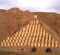 The dagobas are located on Xiakou Mountain in Qingtongxia County on a slope of the west bank of the Yellow River. They are arranged in triangle of twelve rows.