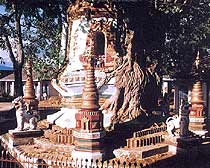 Shubao Pagodas are Buddhist (Lesser Vehicle Sect) buildings. The entire structure consists of a big platform base at the bottom, four small pagodas standing on the base, and four peculiarly-shaped lions between every two small pagodas, featuring the distinctive style of Buddhist pagodas of Burma and Thailand, together with the local colour of Yunnan border areas.