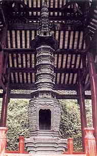 The pagoda resembles the copper pagoda in Xiantong Temple on Mount Wutai, but the inverted bowl on the bottom is bigger and the upper part is made up of double multistorey pavilions divided by a wide pent roof. The pavilions each have seven storeys. The pagoda, including three huge beads on top, is seven metros high. Its main body is covered with high-relief sculptures that appear three-dimensional. Images of Buddha, bodhisattvas, figurines, lions and elephants project from the walls. The sculptures are so splendid that they put the pagoda in first rank among mammoth metal structures.
