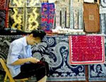 Her Miao boutique is stocked with handcrafted silver hairpins, shaped like birds with dangling chimes, silver bracelets and bangles, as well as Miao girls' clothing in cotton and other fabrics with traditional design elements like hand-stitched embroidery, indigo batik and beads. Treasures like the Miao "Hundred Birds" coats, paired with pendant skirts in silk and cotton, hand-sewn with woven, embroidered and batik fabrics, and decorated with painted beads, hang on the wall.