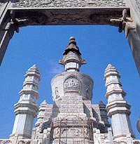The complex of five pagodas was built on a stone platform about three meters high. Two stone archways with ornamental patterns of dragons, phoenixes and the Eight Treasures decorate the sides of the platform. Two strange-looking animals with long tails and wings and tongues sticking out stand in front. They were supposed to scare evil spirits away from the tomb. Such animals were often set in front of official residences and mausoleums. After Buddhism was introduced to China, lions replaced the strange animals to make the temples and statues of Buddha more impressive. The animals in front of the pagoda were a rarity.