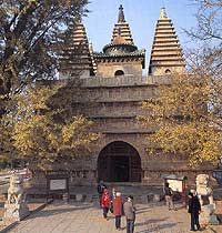 The pagodas were made of brick and marble and their pedestal are square, each side 7.7 meters in length. The whole structure is 17 meters tall, including the five pagodas. The pedestal and five pagodas are all carved in elaborate ornamental patterns. In addition to the five mounts there are sculptures of heavenly guardians, arhats taming dragons and tigers, bodhisattvas, small Buddha statues, Buddha's footprints, vajras, bodhi trees, wheels, vases, lotus petals, scroll patterns, and Sanskrit letters. The sculptured images are very vivid.