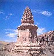 Beside the Mogao grottoes in Dunhuang is a place called Chengziwan where an ornamental pagoda stands. Its interior was built of mud bricks, daubed first with a layer of mud mixed with straw and then with another layer of fine mud. The walls are covered with various kinds of ornamental clay sculptures. A huge Sumeru pedestal supports the one-storey, octagonal chamber of the pagoda. Above the chamber the large main body is in the shape of a lotus flower, looking like a huge column of bouquets. A niche and a Buddhist statue are built into the middle of the flower, and a steeple, in the shape of a square, one-storey pagoda, sits on top. There may once have been discs and a bead over the pagoda, they are now gone.