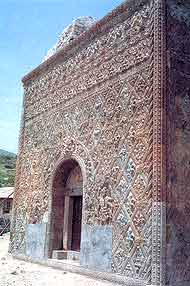 The outside walls of the pagoda's main body are full of carvings of various kinds, formed by bricks carved in the shape of a square, a rhombus, a pentagon or a triangle or simply lines and curves. Altogether, there are 3,442 such bricks, most of them diamond-shaped. The entire tableau is in the form of a curtain and on each corner of the main body is a sculptured pillar whose cross section is hoof-shaped. The pillars are covered with elegant flower designs. The sculptures on the bricks of the pagoda's main body range from heavenly kings, celestial guards, flying apsarases, lions and elephants to Taoist figures and traditional Chinese designs, such as green dragons, white tigers and various kinds of plants, flowers and grasses. Such a combination is rare in early Buddhist sculptures. The sculptures are vigorous and powerful -- the cream of Tang Dynasty relief sculptures. Worth noting are the images of non-Han dancers in the sculptures, demonstrating China's national unity in the Tang Dynasty.