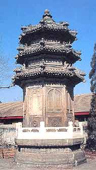 The style of the pagoda is similar to that of a pavilion. The exquisite building is made entirely of carved stone. At the bottom is a Sumeru pedestal ornamented with carved patterns of lotus petals. The octagonal structure is surmounted by a roof with three levels of eaves. The pagoda is about ten meters high. Its most outstanding feature is its faithful imitation of wood components and carvings. The rafters, eaves, tiles, animal ornaments on the roof ridges and bell-patterned windows all follow the style of carved wood. The symbol of Taoism, the pattern of the Eight Diagrams, is carved on the surface of the pagoda. The eaves are supported by closely structured brackets, an ornamental method commonly used in Lamaist dagobes in Tibet and Inner Mongolia. The top of the pagoda is a pavilion-style octagonal structure surmounted by a precious bead, quite different from most Buddhist pagodas.