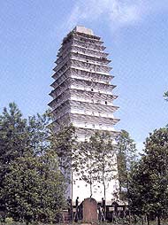 Jiuzhou White Pagoda is a square, thirteen-storey, multi-eave brick structure 29.5 meters high. The front of the first storey has a door, and a winding staircase inside the pagoda leads to the top. Seen from inside, the pagoda has four storeys, and there is a niche for a Buddhist statue on each storey. The pedestal is square, and the first storey is higher than the others. Under the pagoda?s thirteen brick pent roofs are small false windows and holes for letting in air and light. The whole structure is elegant, making it an important representative of multi-eave pagodas of the Song Dynasty.