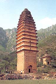 The pagoda is situated in Fawang Temple five kilometers northwest of the county town of Dengfeng at the foot of Yuzhu Peak of Mount Song.