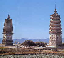 Located in the northeast part of Beizhen County near Jinzhou, the well-preserved twin pagodas are the most complete and magnificent examples of structures built during the Liao and Kin dynasties. The pagodas, facing each other at a distance of about forty meters, are identical multi-eaved structures with thirteen levels. The east pagoda, however, is 43.8 meters high, and the west one 42.7 meters high. The pedestals of both pagodas have brackets, rails and decorative lotus petals made of carved bricks. On the railings are carved swastika patterns, typical of pagoda ornaments of the Liao and Kin dynasties. Circling the pedestals are vivid sculptures of guardians, full of energy. Recesses in the middle of each side of the first storey contain statues of seated Buddha. The recesses are flanked by statues of bodhisattvas under canopies and carved images of flying apsarases. The first level of eaves is supported by carved brick brackets, and the other levels are made of layers of projecting bricks. The pagodas' steeples, composed of a lotus base, a bottle-shaped body, a spire and a precious bead, have remained almost intact.