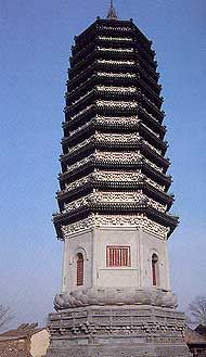 Called formally Ran Deng Sarira (Burning Lamp Buddhist Relic) Pagoda, it stands on the bank of the Baihe River northwest of the county town of Tongxian; it is also known as Tongzhou Pagoda. The pagoda was damaged during an earthquake in 1679 and was reconstructed in 1696. Its style indicates it was built during the Kin Dynasty.