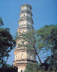 The octagonal, seven-storey brick pagoda is about forty meters high. It looks elegant and graceful. As it stands on an island in the middle of West Lake it is reflected in the water. Mountains faraway serve as background. All this adds to the beauty of the pagoda.