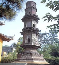 This pagoda, on Beigu Hill in Zhenjiang, was made entirely of cast iron. Because of its location next to Ganlu (Sweet Dew) Temple it was called the Iron Pagoda of Ganlu Temple. The seven-level thirteen-meter pagoda was first build between 825 and 820, but was destroyed at the end of the Tang Dynasty. During the Yuanfeng years (1078-1085) of the Song Dynasty it was reconstructed, but it was blown to the ground by a strong storm in 1582 and restored later with donations collected by some monks. Unfortunately, the pagoda suffered more damage from storms later during the Qing Dynasty. Today only the base and first two storeys are the original Song Dynasty structure,