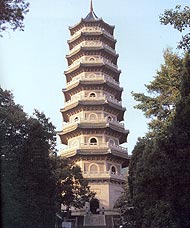 Linggu Pagoda is not related to the Buddhist temple. It was built between 1931 and 1935 as a memorial tower after construction of the Sun Yat-sen Mausoleum was completed in 1929. The pagoda, an octagonal building made of reinforced concrete, has nine levels and is more than sixty meters tall. The roof was covered with green glazed tiles and the exterior was modeled after ancient styles. Each storey is surrounded by a railed balcony. A spiral staircase circles a central pillar from the ground to the very top. Tourists can enjoy a bird's-eye view of Zhongshan Mountain and Nanjing City from the top of the pagoda.
