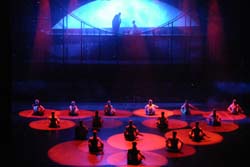 One bold scene uses plastic models and pools of water. The suspension of seven models in the air suggests the separation of body and soul of the monk Chun Yi, and human beings in general. Two modern dancers playing the role of lovers in the earthly world enjoy their sensual happiness in one of the pools of water on stage, which represents the world of moral deviance. Chun Yi fails to resist the temptation and falls into the pool. A model implies the body is dragged by the monk from the contaminated pool to a pure, clean one. But soon the model is seized and taken back to the corrupt pool. The inner conflict of the monk is vividly embodied in such scenes.