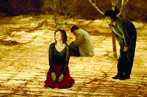 The enlarged stage has been transformed into a cherry orchard, with eight forlorn trees dotting the yellow earth. And a foreboding sky of limestone bears down upon the audience. Here resembles a grotto, and one can only marvel at the stage designers, Yi Liming and Tan Shaoyuan, who have worked wonders to craft this life-like landscape from plastic and iron wires.