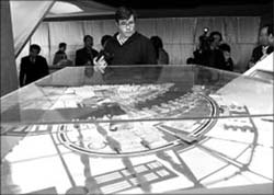 A visitor looks over a model of a design by French architects at the expo "French Visions: city, architecture, sustainable development" in Beijing.