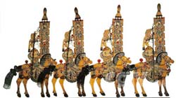 Shadow play includes the role types of traditional Chinese opera: the sheng (male role), dan (female role), jing (painted-face role) and chou (clown role). The heads and bodies of the figures are disposed separately. A shadow play group usually has about 400 figure heads, 150 figure bodies and 100 other figure props like tables, chairs, horses and weapons.