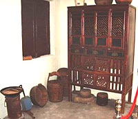On the way to the stairs is a kitchen where pans, a coal stove and other cooking stuffs are kept in their original form.