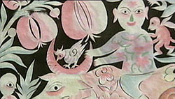 As the name suggests, a smoked painting is in fact a smoked paper-cut. The artist must put a paper-cut on another piece of paper, dampen it with water, and smoke the whole thing until it becomes blackened. The paper cut is then torn away to reveal the colored picture beneath.