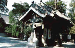 Noises of people at the gate disappear suddenly when one enters the temple. A solemn atmosphere reigns here. The blue tiles, red paint on doors and millennium-old but still lush trees calm people.