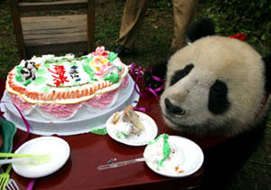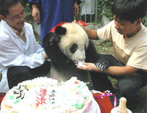 Giant panda Lousheng is served a piece of cake during his birthday party Monday at an animal center in west China's Shaanxi Province. Lousheng, who is one year old, is the first artificially bred giant panda in Shaanxi Province.