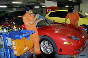 Except for the usual way of pouring tap water on cars that is widely taken by fly-by-night outlets, minimum water use techniques include washing cars with recycled water, high-pressure vapor spray and detergent.