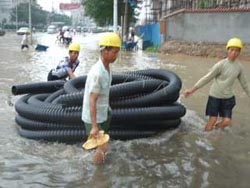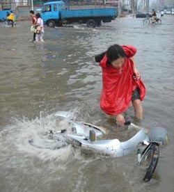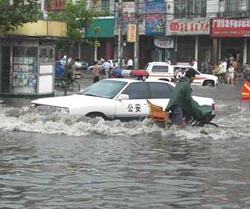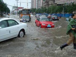 Torrential rains, lasted for more than two hours, flooded the streets of Zhengzhou, central China's Henan Province on August 9, 2004, causing severe traffic jams. It is reported water in some areas was as deep as one meter.