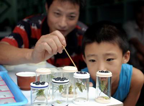 Shen Fuhong, a stall owner on Jiangyin Road, Shanghai, shows his "autumn insects" to Jia Yan. As autumn approaches, many people will buy such insects.