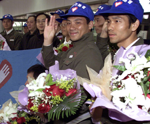 A team of 18 young Chinese volunteers is welcomed at Beijing Capital International Airport upon arrival from Thailand March 8, 2005. They had worked in tsunami-stricken areas in Thailand, salvaging sunken boats and retrieving debris deposited on the seabed.