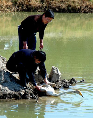 Two local policemen clean wings for a swan in Turpan Prefecture of northwest China's Xinjiang Uygur Autonomous Region on April 12, 2005. The white swan fell to a farmland due to illness during its migration on April 5. Local police came to its rescue after farmers spotted it and informed the police.