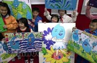Children show their works for a designing competition under the theme of water marking the World Water Day in Beijing, capital of China, March 22. Some 100,000 primary school pupils in Beijing attended the competition.