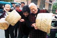 Residents of a Shanghai community receive free bamboo baskets as the local government encourages people to use fewer plastic shopping bags.