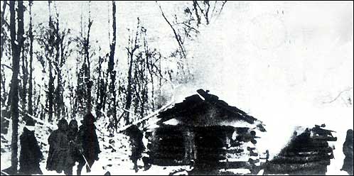 One of the camping grounds set up by the Northeast Anti-Japanese Allied Army fighters in the dense forests in the Northeast.