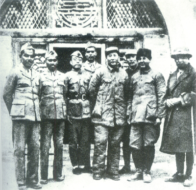Mao Zedong with the members of the Indian Aid-China Medical Mission in Yanan on March 15, 1939: Mao Zedong (fifth from left), B.K. Basu (first from left), D.S. Kotnis (second from left), D. Mukerji (fourth from left), M. Atal (seventh from left) and M. Cholkar (eighth from left).