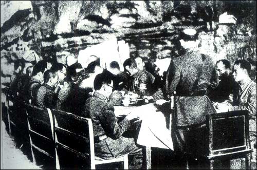 Chinese army commanders at a military meeting in a cave during the decisive battle at south Guangxi.