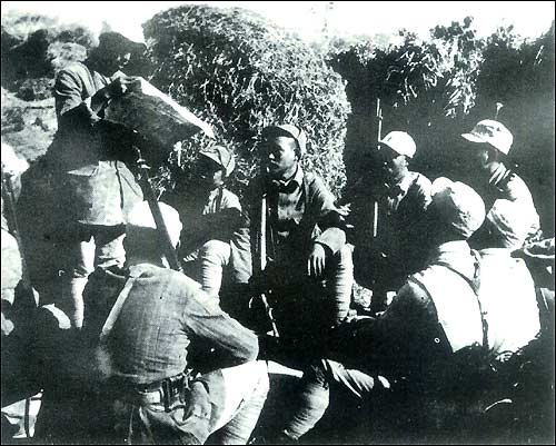 Soldiers of the Eighth Route Army persevering in their fight in the enemy's rear areas of north China listen to the victory news of the "Hundred Regiment Campaign."