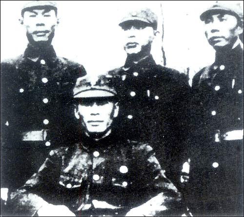 Xie Jinyuan (sitting) and his subordinates. When Japanese troops launched an attack on Shanghai on August 13, 1937, Chinese troops resisted tenaciously. Xie Jinyuan, deputy commander of the 524th Regiment, led his men in fierce battles to defend Sihang warehouses, during which 800 of his soldiers died a heroic death.