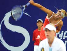 Though Sharapova and her compatriot Vera Zvonareva enjoyed a clear advantage in the first set by leading 6-1, they lost to the Japanese pair Shinobu Asagoe/Rika Fujiwara in the following sets, 3-6, 4-6.