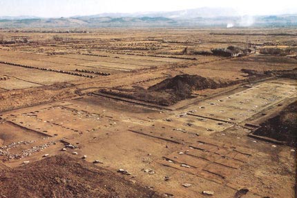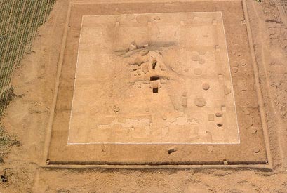 The palace site, facing the southeast, consists of a main hall, corridor, back chamber, frontispiece and cloister. The frontispiece lies in the middle of a northeast cloister; the main hall, symmetrical with frontispiece, lies in the northeast cloister; the back chamber lies behind the main hall; the corridor connects the main hall and the back chamber; the cloister is a square and the each side is 184 meters long.