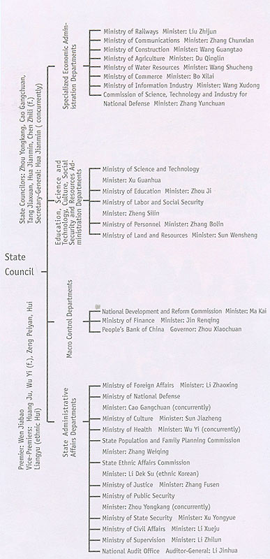 The Premier of China chairs the State Council, which is the cabinet or chief administrative body of the PRC that includes the heads of all governmental agencies. The Premier is nominated and appointed by the President with NPC approval. The term of office of the State Council is five years. The State Council is composed of the Premier, the Vice-Premiers, the State Councilors, the Secretary-General, the Ministers in charge of ministries, the Ministers in charge of commissions, the Governor of the People's Bank of China, and the Auditor-General of the National Audit Office. The current premier is Wen Jiabao.